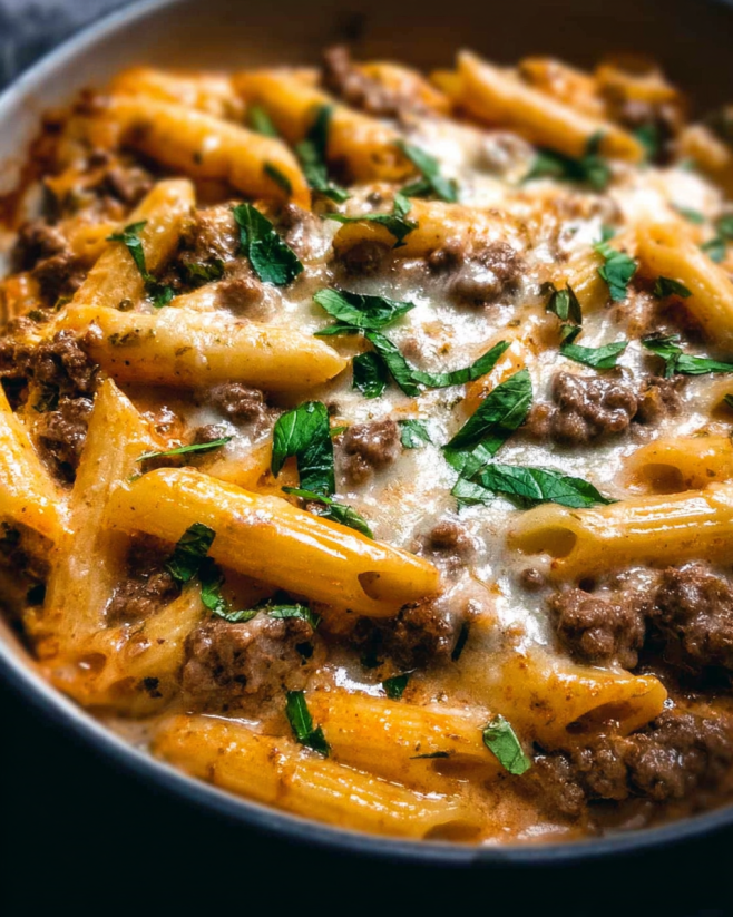 A comforting and delicious meal combining tender penne pasta with savory ground beef in a rich and creamy sauce.