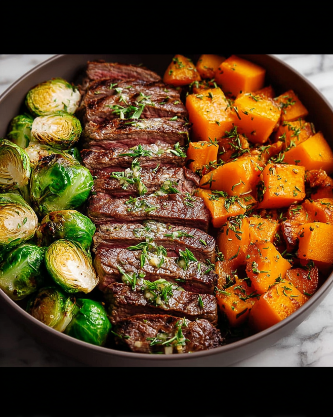 A delicious and satisfying meal combining tender steak, vibrant Brussels sprouts, and sweet butternut squash with a rich garlic butter sauce.